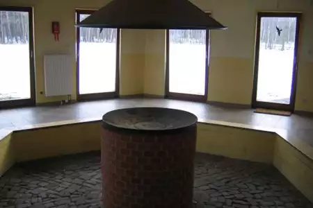 Der große Versammlungsraum hat in der Mitte eine abgenommene (!) offene Feuerstelle.