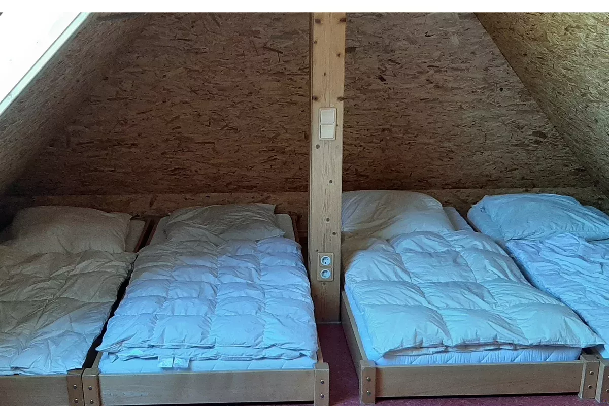 2. Etage (DG): Den Dachspitz kann man mit einer Schiebetür auf 2 Räume aufteilen. Hier sind insgesamt 10 einfache Einzelbetten vorhanden.
