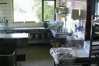 Es gibt einen Küchenraum, einen Spülraum und einen Raum für die Zubereitung der Speisen.