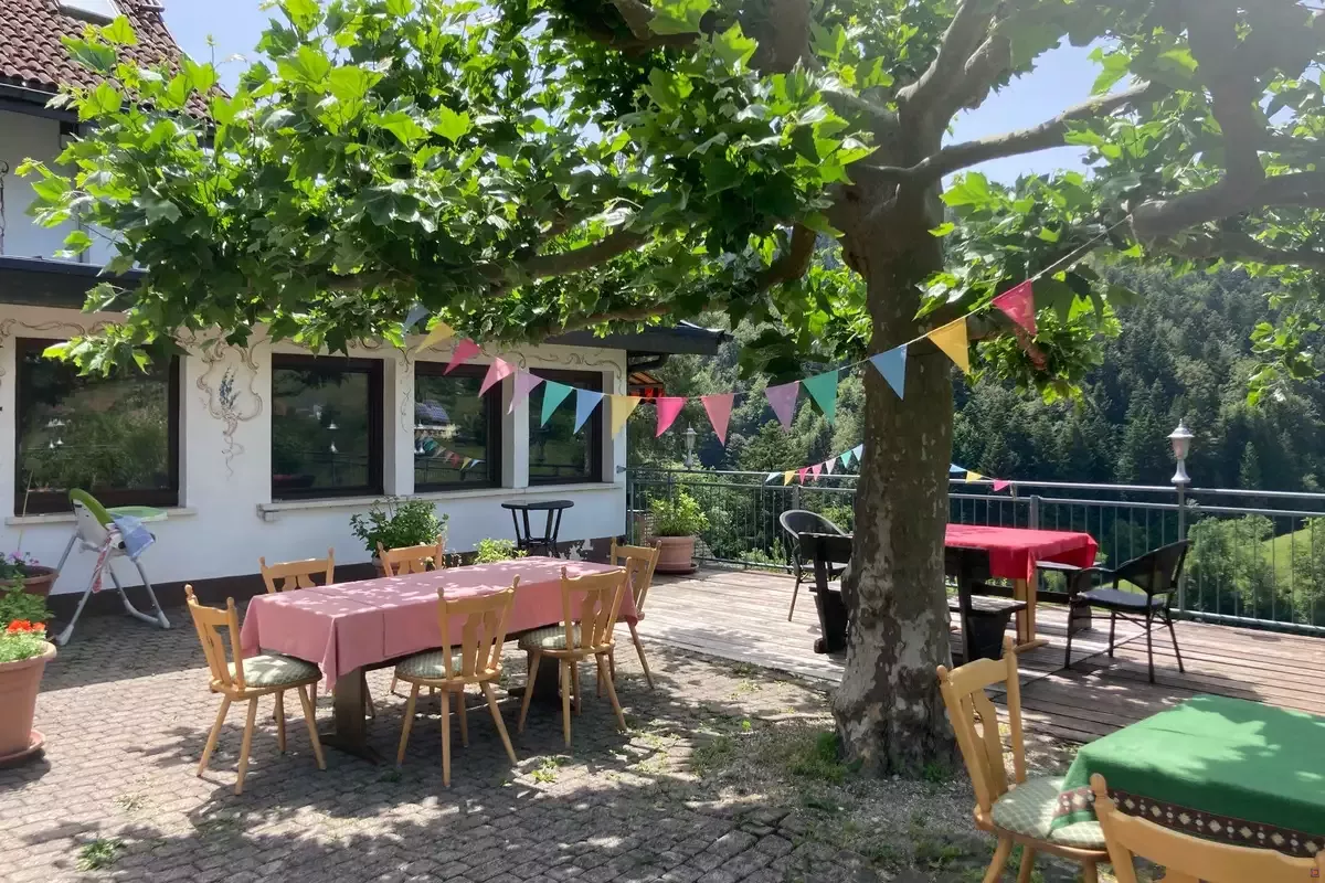 Die Sonnenterrasse mit herrlichem Blick über das Tal, kann in den warmen Monaten extra gebucht werden,.