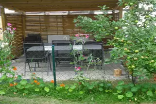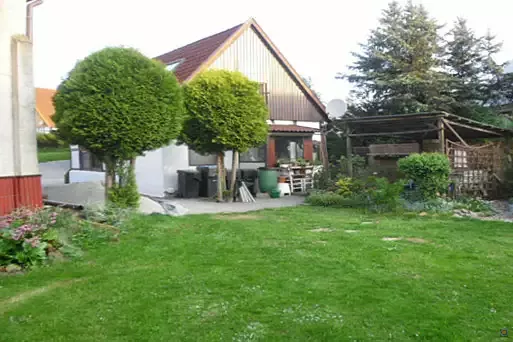schöne ruhig gelegene Außenanlage mit 2 Terrassen, Grill, Liegewiese. Großer Spielplatz im Dorf fußläufig ca. 5 Min. Spazier-, Wander -und Joggingmöglichkeiten direkt vom Haus aus.