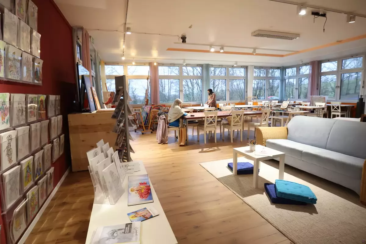 Einer unserer beliebtesten Räume ist das Atelier, weil hier über die Jahre hinweg in stiller Meditation eine Menge Kunst entstanden ist. Der Raum strahlt einfach Ruhe aus! Dank des schönen natürlichen Lichts in diesem großen und offenen Raum ist das Atelier perfekt für Kunstkurse geeignet, aber auch andere Arten von Kursen können diesen Raum optimal nutzen. Tische und Stühle können auf vielfältige Weise angeordnet werden, und die angrenzende Terrasse kann ebenfalls genutzt werden. Zudem ist dieser Raum mit einer großen Projektionsleinwand für Präsentationen ausgestattet.