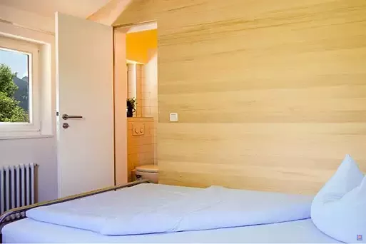 Ein Doppelzimmer mit Dusche/WC hat ein Doppelbett, das andere getrennte Betten. Von den 7 Dreibettzimmern haben 4 ein Hochbett, jeweils 2 Betten unten und eines in der Empore. Das Vierbettzimmer ist ein neues großes Dreibett mit Hochbett.