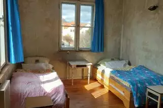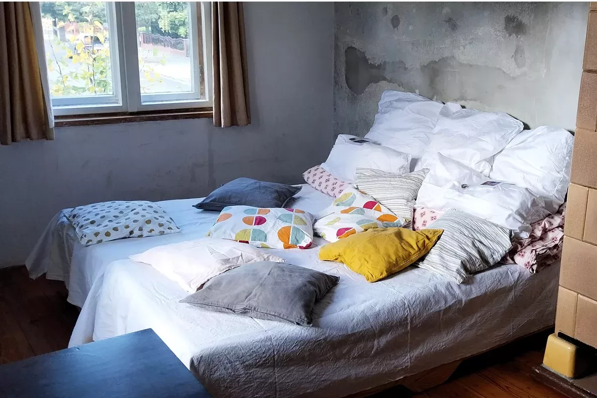 Die Möblierung ist flexibel gehalten mit Stapelbetten, Tischen und Stühlen. Haushaltgegenstände und Wäsche sind da. Im Freibereich sind ein großer Sitzplatz und Liegestühle.