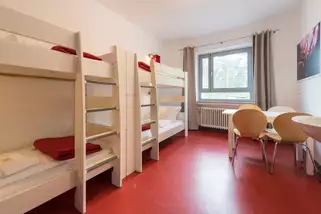 Economy- & Hostel-Bereich (Rotes Haus, Lila Haus, Grünes Haus): Funktionale Mehrbettzimmer mit praktischer Ausstattung, zum Teil mit Dusche/WC im Zimmer oder mit sanitären Anlagen auf dem Flur. Für Begleitpersonen stehen hier auch Einzelzimmer mit Bad zur Verfügung.