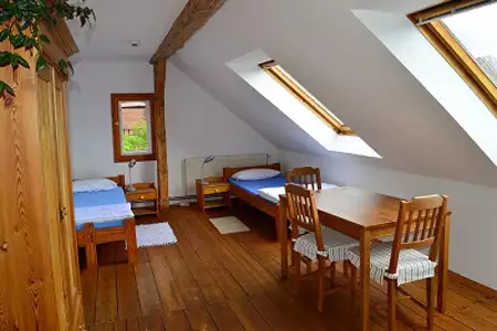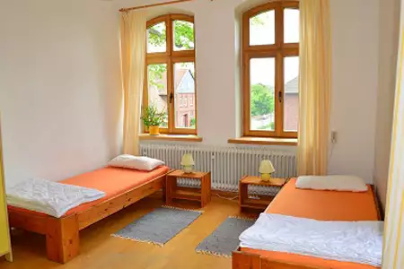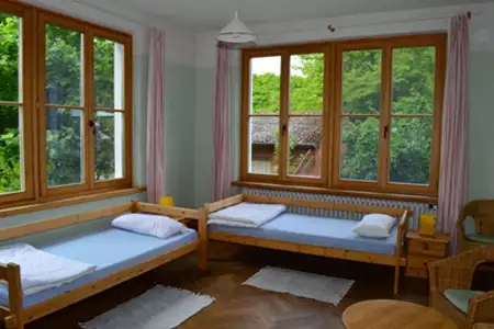 11 Schlafräume mit 2-6 Betten bieten Platz für 38 Menschen, bei entsprechender Flexibilität auch für mehr. Das Erdgeschoss, in dem sich drei Schlafräume mit jeweils 3 Betten befinden, ist barrierefrei von RollstuhlfahrerInnen zu befahren, ein rollstuhlgerechtes Bad ist vorhanden.