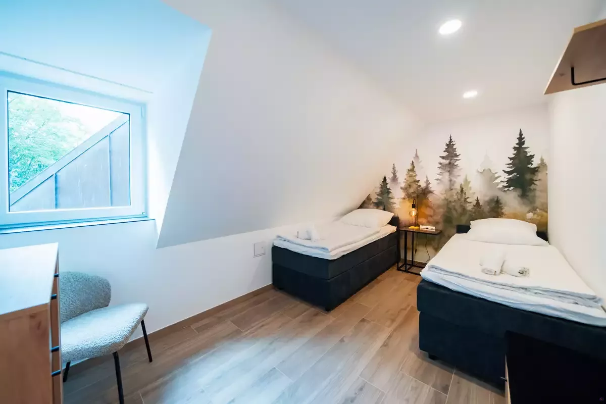 Das Haus ist umgeben von viel Wald und Wiesen (Alleinlage) und bietet 33 Übernachtungsplätze in 17 Ein-, Zwei- und 3 Bettzimmern mit Dusche und WC.