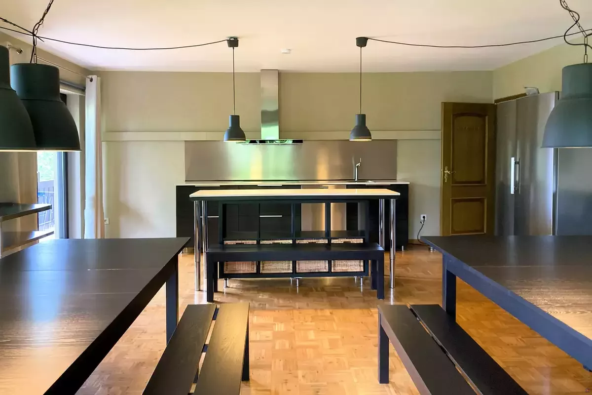 Kochutensilien, zwei große Kühlschränke, Geschirrspülmaschine, Minibackofen, Herd, große Heißluftfritteuse, (Pad-)Kaffeemaschine, Wasserkocher, Geschirr und Besteck, Sitzbänke und Tische, Balkonzugang*