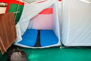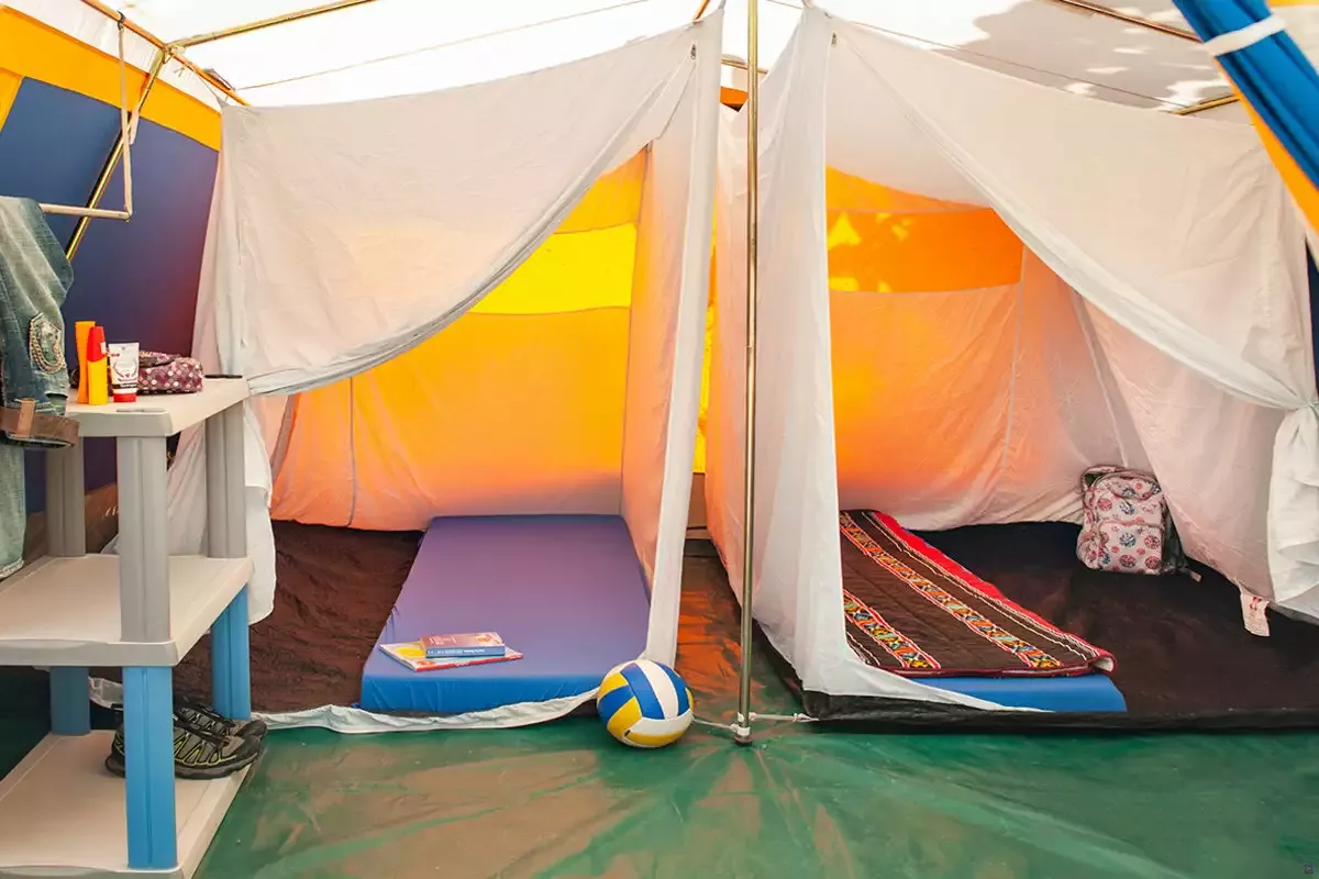 Unser Komfortcamp besteht aus Steilwandzelten die mit einer Bodenplane und zwei Innenzelten ausgestattet sind. In den Innenzelten befinden sich Luftbetten oder Rolllattenroste mit Matratzen. Die Belegung im Zelt ist für 4 Personen geplant. Betreuerzelte werden zusätzlich mit Strom, Licht und einem Regal ausgestattet. Das Aufenthaltszelt ist ebenfalls mit Strom, Tischen und Bänken ausgestattet.