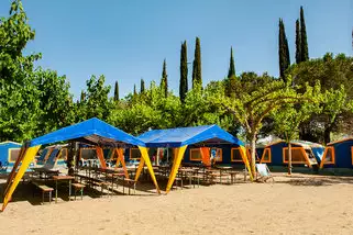 Das Camp Eurostage steht auf den baumbeschatteten Terrassen des gleichnamigen Campingplatzes. Kleine Fußwege verbinden die Camps. Jede Gruppe bewohnt ihr eigenes Zeltdorf mit Dorfplatz. Unser Komfortcamp besteht aus Steilwandzelten für 4 Personen, ein Aufenthaltszelt und ein vollausgestattetes Küchenzelt. Das umfangreiche Freizeitangebot des Campingplatzes darf mit genutzt werden. So laden ein Pool, ein großer Fitnesskomplex, Beachvolleyballfeld und ein Bolzplatz zu gemeinsames Aktivitäten ein.