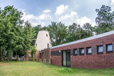 Der alte Mühlenturm mit seinen 30 Betten in 6 Räumen bietet durch seine runden Mauern eine ganz besonders behagliche Atmosphäre. Die Treppe schlängelt sich von Etage zu Etage und führt schließlich zu den beiden Einzelzimmern im Mühlenkopf. Der Gruppe stehen daneben ein 2-Bett, ein 4-Bett und ein 6-Bett-Zimmer sowie ein Schlafraum mit 16 Betten zur Verfügung. Im Erdgeschoss bietet ein Aufenthaltsraum reichlich Platz. Hier lassen sich gemütliche Abende ebenso gut gestalten wie kreatives Basteln oder konzentriertes Arbeiten.
