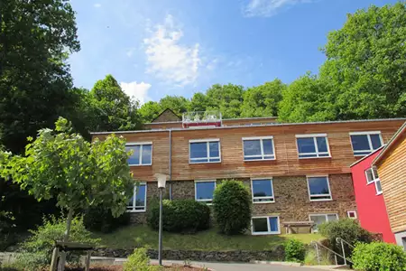 Auf unserem großzügigen Außengelände befindet sich ein Bolzplatz, Basketballkörbe sowie eine Tischtennisplatte. Ein Niedrigseilgarten, ein Kletterseil über den Gelbach sowie eine Kletterwand am Haus bieten verschiedene Möglichkeiten für erlebnispädagogische Angebote.