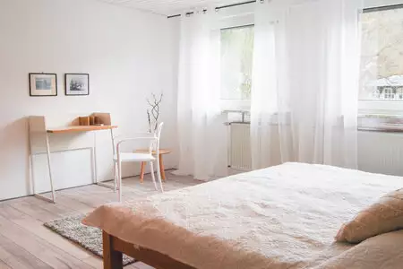 Das Schlafzimmer verfügt großes Kingsize-Bett (180x200 cm), einen geräumigen Schrank und einen Schreibtisch für ruhiges Arbeiten.