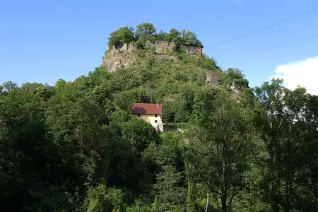 Westlich vom Bodensee und eingebettet in die Vulkanlandschaft Hegau befindet sich die Burg Hohenkrähen, auf Höhe der Vorburg unterhalb der eigentlichen Burgruine das Gruppenhaus.