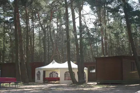 Unsere Mehrbett-Holzbungalows sind jeweils mit drei Etagenbetten, Spinden und einer Sitzecke ausgestattet. Die Unterkünfte sind in U- und L-Form aufgestellt und bilden somit gruppengerechte Innenräume, in welchen Pavillons mit Biertischgarnituren zum Verweilen und gemeinsamen Aktivitäten einladen. Die Sanitäranlagen mit Duschkabinen, Wasch- und Toilettenräumen befinden sich zentral auf dem Areal.